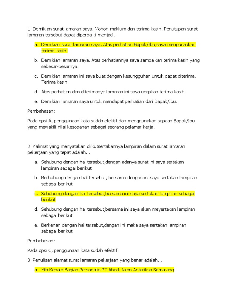 Kumpulan soal pilihan ganda materi surat lamaran pekerjaan 1.